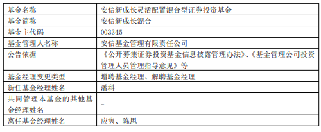 中国经济网北京1月26日讯 近日,安信基金公告,安信招信一年持有混合、安信新成长混合增聘潘科。