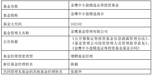 中国经济网北京1月29日讯 今日,金鹰基金公告,金鹰智慧生活混合、金鹰中小盘精选混合增聘陈颖。
