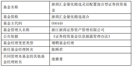 中国经济网北京1月30日讯 昨日,浙商证券资产管理有限公司公告,浙商汇金量化精选混合增聘陈顾君。