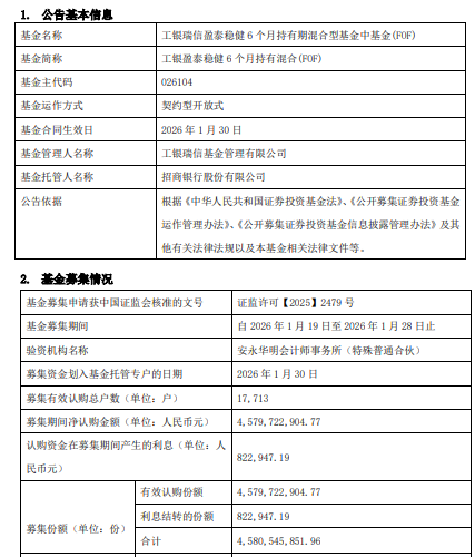 募集期间净认购金额4,579,722,904.77元,认购资金在募集期间产生的利息822,947.19元,募集份额合计4,580,545,851.96份。