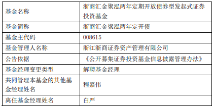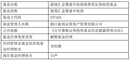 中国经济网北京2月2日讯 近日,浙商证券资产管理有限公司公告,白严离任浙商汇金月享30天滚动持有中短债、浙商汇金聚泓两年定开债、浙商汇金聚兴一年定开债券发起式、浙商汇金金算盘货币、浙商汇金聚盈中短债、浙商汇金中证同业存单AAA指数7天持有、浙商汇金聚利一年定期。