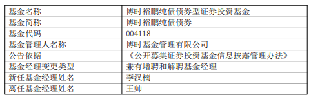 中国经济网北京2月4日讯 今日,博时基金公告,博时裕鹏纯债债券、博时裕达纯债债券增聘李汉楠,王帅离任。