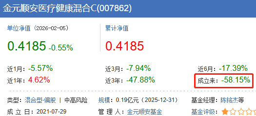 根据天天基金网最新数据看,成立于2021年7月29日的金元顺安医疗健康混合A/C,截至2026年2月5日的最新累计收益率为-57.76%和-58.15%。该基金先后经历2次基金经理变更,目前由陈铭杰和张海东共同管理,但从各阶段的基金经理任职回报看,都无一盈利。