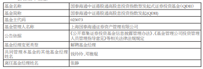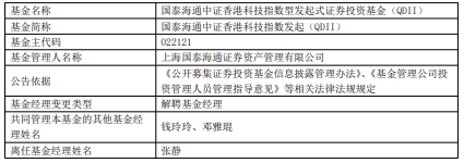中国经济网北京2月6日讯 今日,国泰海通资管公告,张静离任国泰海通中证港股通高股息投资指数发起(QDII)、国泰海通中证香港科技指数发起(QDII)。