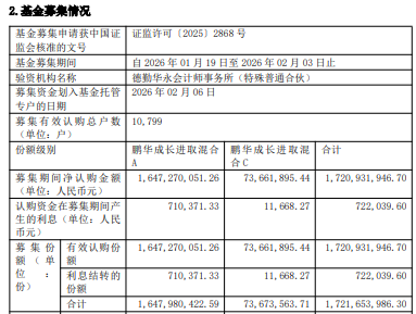 募集期间净认购金额1,720,931,946.70元,认购资金在募集期间产生的利息722,039.60元,募集份额合计1,721,653,986.30份。