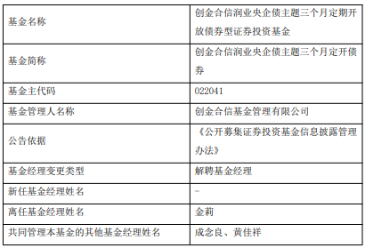 中国经济网北京2月10日讯 今日,创金合信基金公告,金莉离任创金合信润业央企债主题三个月定开债券。