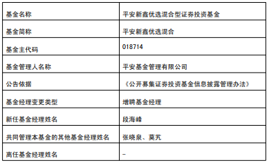 中国经济网北京2月24日讯 近日,平安基金公告,平安新鑫优选混合增聘段海峰。