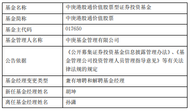 中国经济网北京2月24日讯 近日,中庚基金公告,中庚港股通价值股票增聘胡坤,孙潇离任。