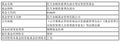 中国经济网北京2月24日讯 近日,民生加银基金公告,民生加银质量领先混合增聘周帅。