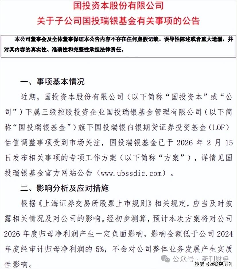 国投资本表示,针对上述事件的工作方案将影响公司2026年归母净利润,但影响金额低于公司2024年度经审计归母净利润的5%,不会对公司整体业务发展产生实质性影响。同日,国投白银LOF也公告将于2026年2月24日开市起至当日10:30停牌。
