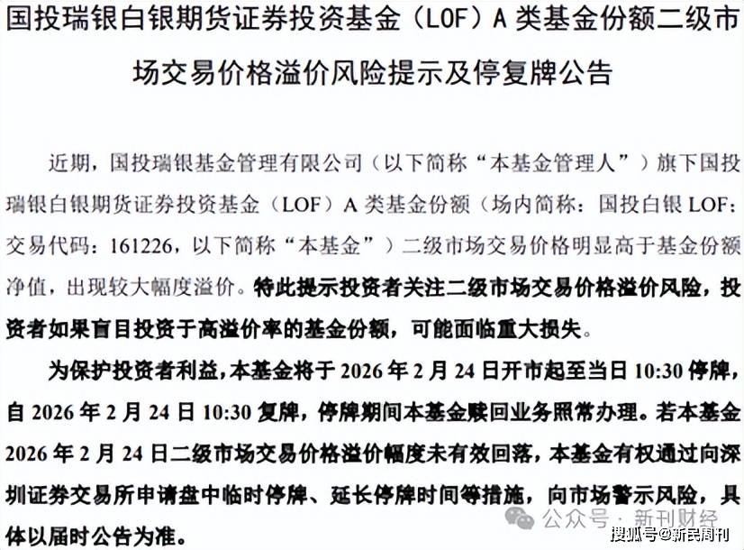值得注意的是,公告中还提到若基金2月24日二级市场交易价格溢价幅度未有效回落,基金有权通过向深交所申请盘中临时停牌、延长停牌时间等措施,继续向市场警示风险。这一补充约定,进一步凸显基金管理方对当前白银市场存在较高风险的重视。