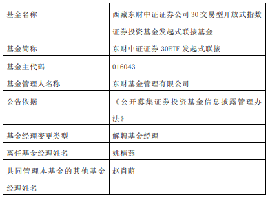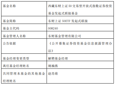 中国经济网北京2月25日讯 今日,东财基金公告,姚楠燕离任东财中证500ETF发起式联接、东财中证证券30ETF发起式联接、东财上证50ETF发起式联接、东财创业板ETF发起式联接、东财中证芯片ETF发起式联接。