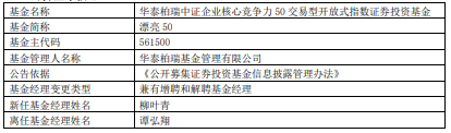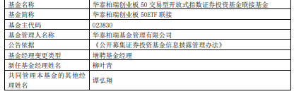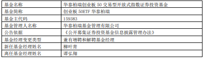 中国经济网北京2月26日讯 今日,华泰柏瑞基金公告,华泰柏瑞中证企业核心竞争力50ETF、泰柏瑞上证180ETF、华泰柏瑞创业板50ETF联接、华泰柏瑞上证180ETF联接、华泰柏瑞创业板50ETF增聘柳叶青。