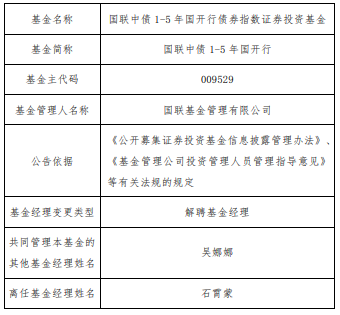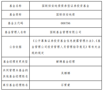 中国经济网北京3月2日讯 近日,国联基金公告,石霄蒙离任国联中债1-5年国开行、国联聚通定期开放债券、国联恒安纯债。