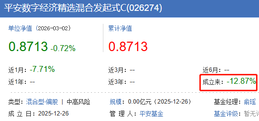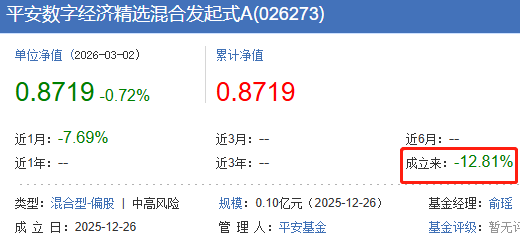 资料显示,该基金成立于2025年12月26日,尽管目前还没有过建仓期,但从截至到今年3月2日的累计收益率看,其A/C份额已经分别下跌12.81%和12.87%。