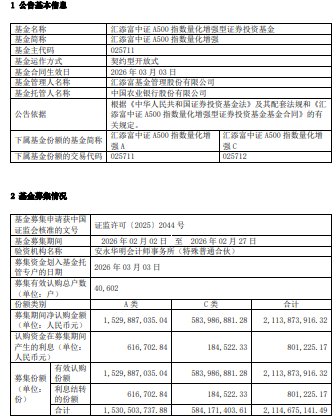 中国经济网北京3月4日讯 今日,汇添富基金发布汇添富中证A500指数量化增强型证券投资基金基金合同生效公告。