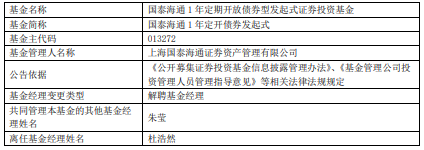 中国经济网北京3月9日讯 今日,国泰海通证券资管公告,杜浩然离任国泰海通1年定开债券发起式,朱莹管理。