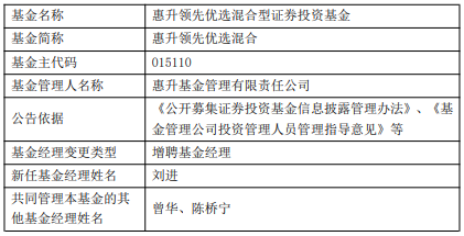 中国经济网北京3月11日讯 今日,惠升基金公告,惠升领先优选混合增聘刘进。