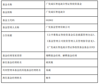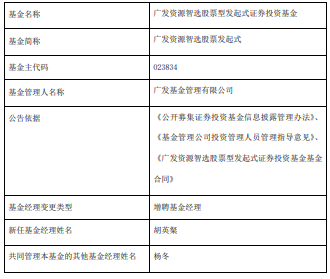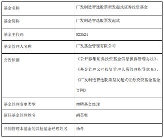 中国经济网北京3月12日讯 今日,广发基金公告,广发制造智选股票发起式、广发成长智选混合、广发资源智选股票发起式增聘胡英粲。