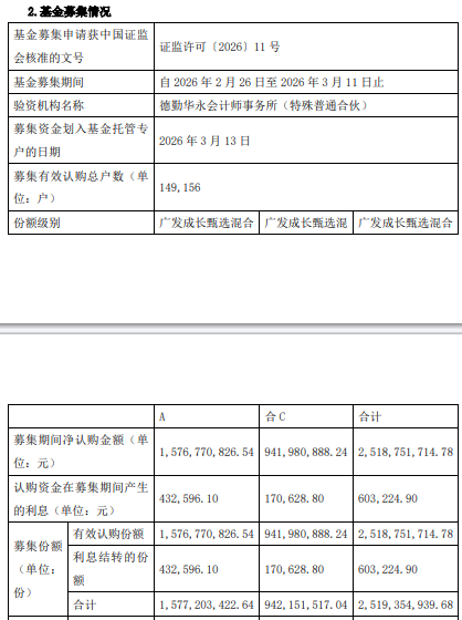 募集期间净认购金额2,518,751,714.78元,认购资金在募集期间产生的利息603,224.90元,募集份额合计2,519,354,939.68份。