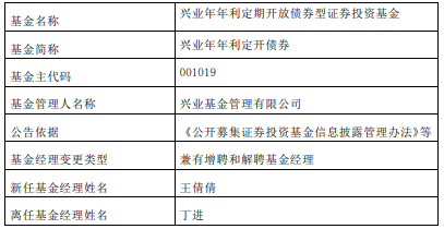 中国经济网北京3月18日讯 今日,兴业基金公告,兴业年年利定开债券增聘王倩倩,丁进离任。