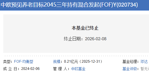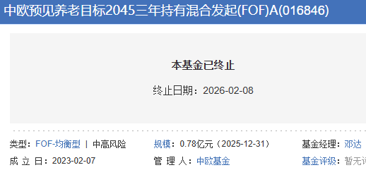 该基金于2026年2月8日(含,下同)起进入清算程序,由该基金管理人中欧基金管理有限公司、基金托管人招商银行股份有限公司、安永华明会计师事务所(特殊普通合伙)和上海市通力律师事务所组成基金财产清算小组履行基金财产清算程序,并由安永华明会计师事务所(特殊普通合伙)对清算报告进行审计,上海市通力律师事务所对清算报告出具法律意见。
