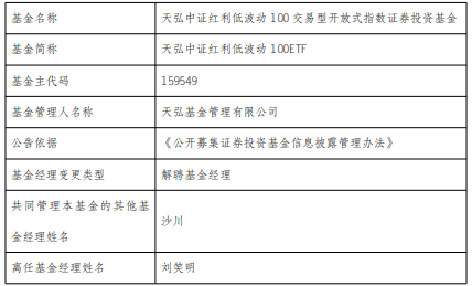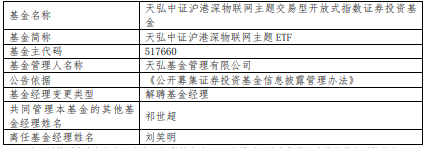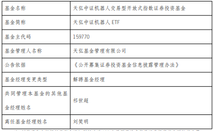 中国经济网北京3月19日讯 今日,天弘基金公告,刘笑明离任天弘中证机器人ETF、天弘中证沪港深物联网主题ETF、天弘中证红利低波动100ETF。