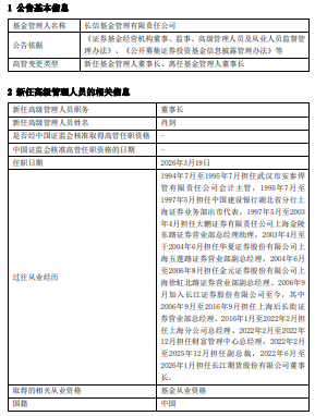 中国经济网北京3月23日讯 近日,长信基金公告,任命肖剑为董事长,原董事长刘元瑞离任,继续担任公司董事。