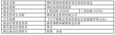 中国经济网北京3月24日讯 今日,博时基金公告,博时裕利纯债债券增聘胥艺,陈黎、余斌离任。