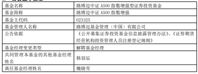 中国经济网北京3月26日讯 今日,路博迈基金公告,魏晓雪离任路博迈中证A500指数增强,韩羽辰管理。