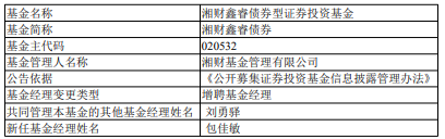 中国经济网北京3月26日讯 今日,湘财基金公告,湘财鑫睿债券增聘包佳敏。