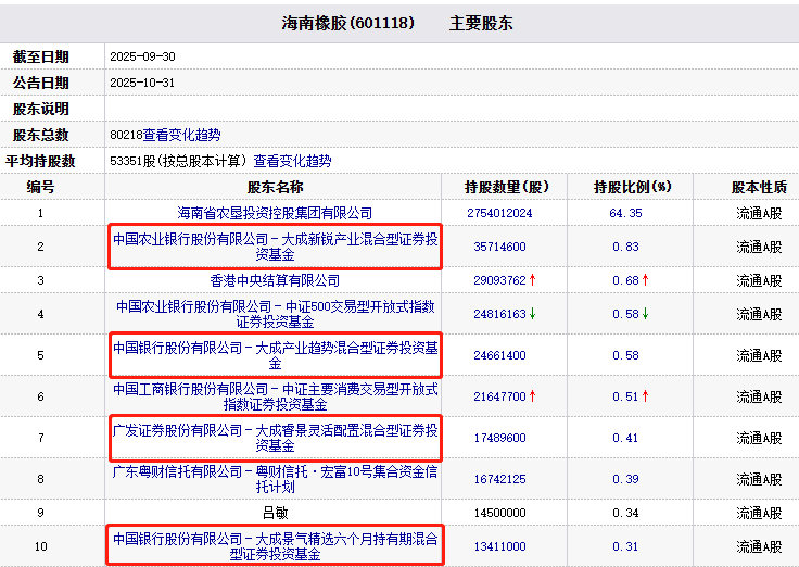 根据海南橡胶2025年三季报显示,大成基金旗下的大成新锐产业混合型证券投资基金、大成产业趋势混合型证券投资基金、大成睿景灵活配置混合型证券投资基金、大成景气精选六个月持有期混合型证券投资基金分别持有该公司3571.46万股、2466.14万股、1748.96万股、1341.10万股,位居该公司第2、第5、第7和第10位流通股东。
