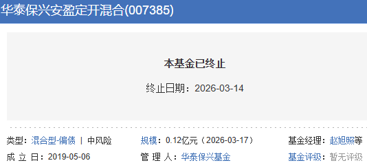 根据《华泰保兴安盈三个月定期开放混合型发起式证券投资基金开放日常申购、赎回、转换业务的公告》,该基金第二十一个开放期为2026年2月6日至2026年3月13日。截至本次开放期最后一个开放日日终(登记机构完成最后一个开放日申购、赎回业务申请的确认以后),该基金基金资产净值低于5000万元,已触发《基金合同》终止情形。根据《基金合同》有关约定,基金管理人依据基金财产清算程序对该基金进行财产清算并终止基金合同,无需召开基金份额持有人大会进行表决。