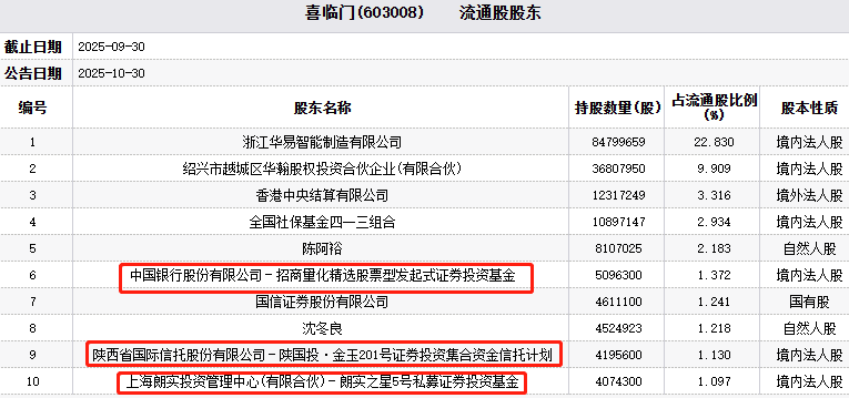截至2025年9月30日,喜临门前十大流通股股东中,第六大流通股股东为招商量化精选股票型发起式证券投资基金,持股509.63万股,占流通股比例1.372%。