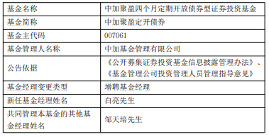 中国经济网北京4月9日讯 今日,中加基金公告,中加聚盈定开债券增聘白亮。