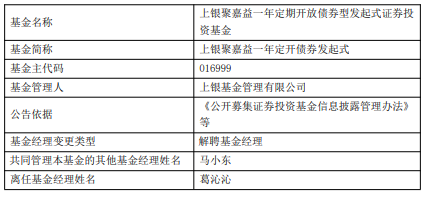 中国经济网北京4月10日讯 今日,上银基金公告,葛沁沁离任上银聚嘉益一年定开债券发起式,马小东管理。
