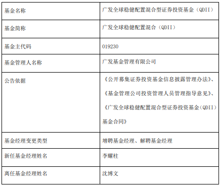 中国经济网北京4月10日讯 今日,广发基金公告,广发全球稳健配置混合(QDII)增聘李耀柱,沈博文离任。