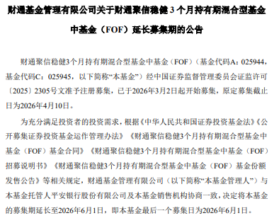公告称,财通聚信稳健3个月持有期混合型基金中基金(FOF)(基金代码A:025944,基金代码C:025945)经中国证券监督管理委员会证监许可〔2025〕2305号文准予注册募集,已于2026年3月2日起开始募集,原定募集截止日为2026年4月10日。现决定将该基金的募集期延长至2026年6月1日,即该基金最后一个募集日为2026年6月1日。