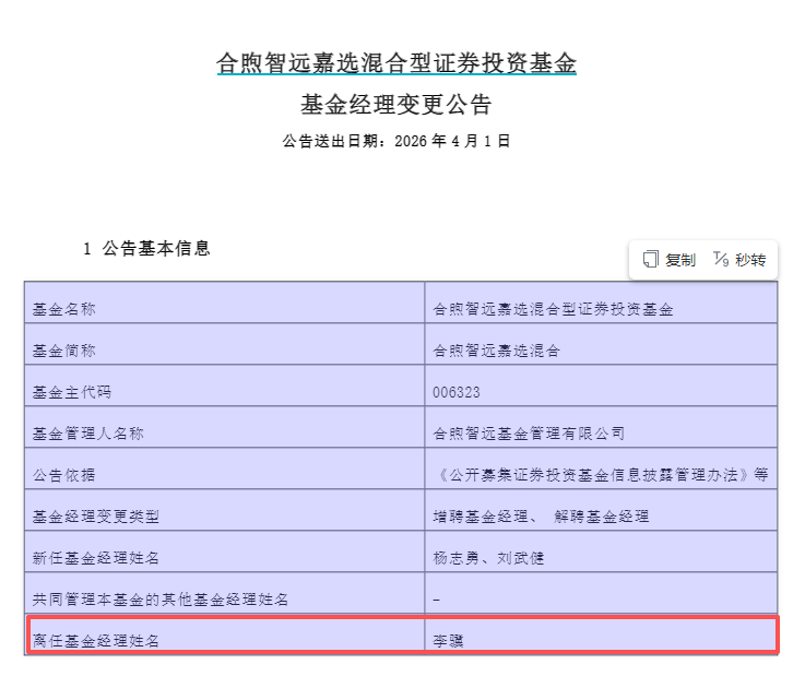 2月中旬,合煦智远基金曾因一则高管变更公告引发市场关注。彼时公司公告显示,李骥离任总经理,董事长郑旭代任总经理;同日离任的还有副总经理陶安虎。公告披露时,李骥仍保留基金经理身份。