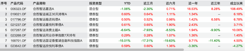 从产品结构看,合煦智远以债券类产品为主,权益类产品仅3只,但有限的权益产品也未能在今年跑出亮眼表现。