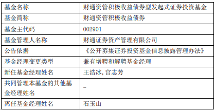 中国经济网北京4月13日讯 近日,财通资管公告,财通资管积极收益债券增聘王浩冰与宫志芳,石玉山离任。
