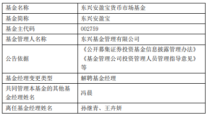 中国经济网北京4月15日讯 今日,东兴基金公告,孙继青、王卉妍离任东兴安盈宝,冯晨管理。