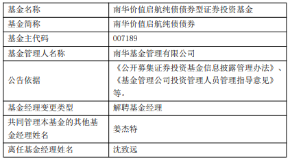 中国经济网北京4月16日讯 今日,南华基金公告,沈致远离任南华价值启航纯债债券,姜杰特管理。