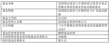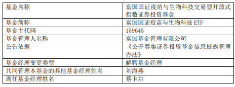 蔡卡尔离任富国国证疫苗与生物科技ETF与联接基金