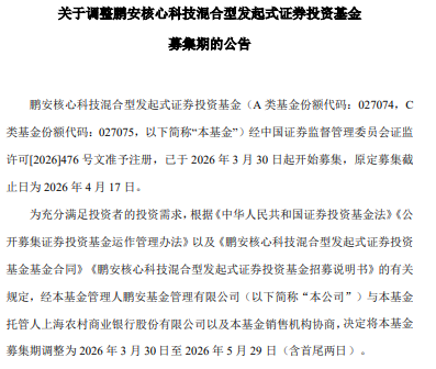 公告称,鹏安核心科技混合型发起式证券投资基金(A类基金份额代码:027074,C类基金份额代码:027075)经中国证券监督管理委员会证监许可[2026]476号文准予注册,已于2026年3月30日起开始募集,原定募集截止日为2026年4月17日。现决定将该基金募集期调整为2026年3月30日至2026年5月29日(含首尾两日)。