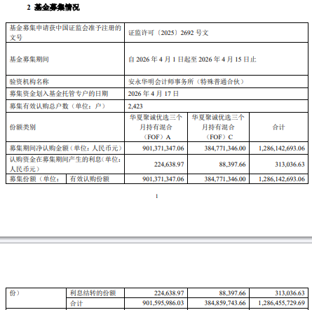 募集期间净认购金额1,286,142,693.06元,认购资金在募集期间产生的利息313,036.63元,募集份额合计1,286,455,729.69份。