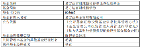 中国经济网北京4月20日讯 近日,易方达基金公告,杨真离任易方达富财纯债债券,毛毳管理。