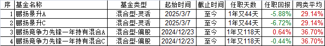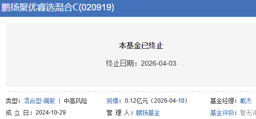 截至2026年4月2日最后一次披露净值日,鹏扬聚优睿选混合A/C的累计单位净值为0.9848元、0.9767元,累计收益率为-1.52%、-2.33%。