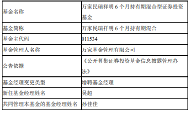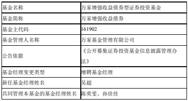 中国经济网北京4月21日讯 今日,万家基金公告,万家增强收益债券、万家民瑞祥明6个月持有期混合增聘吴超。