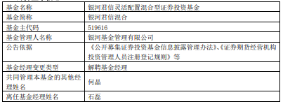 中国经济网北京4月21日讯 今日,银河基金公告,石磊离任银河君信混合,何晶管理。